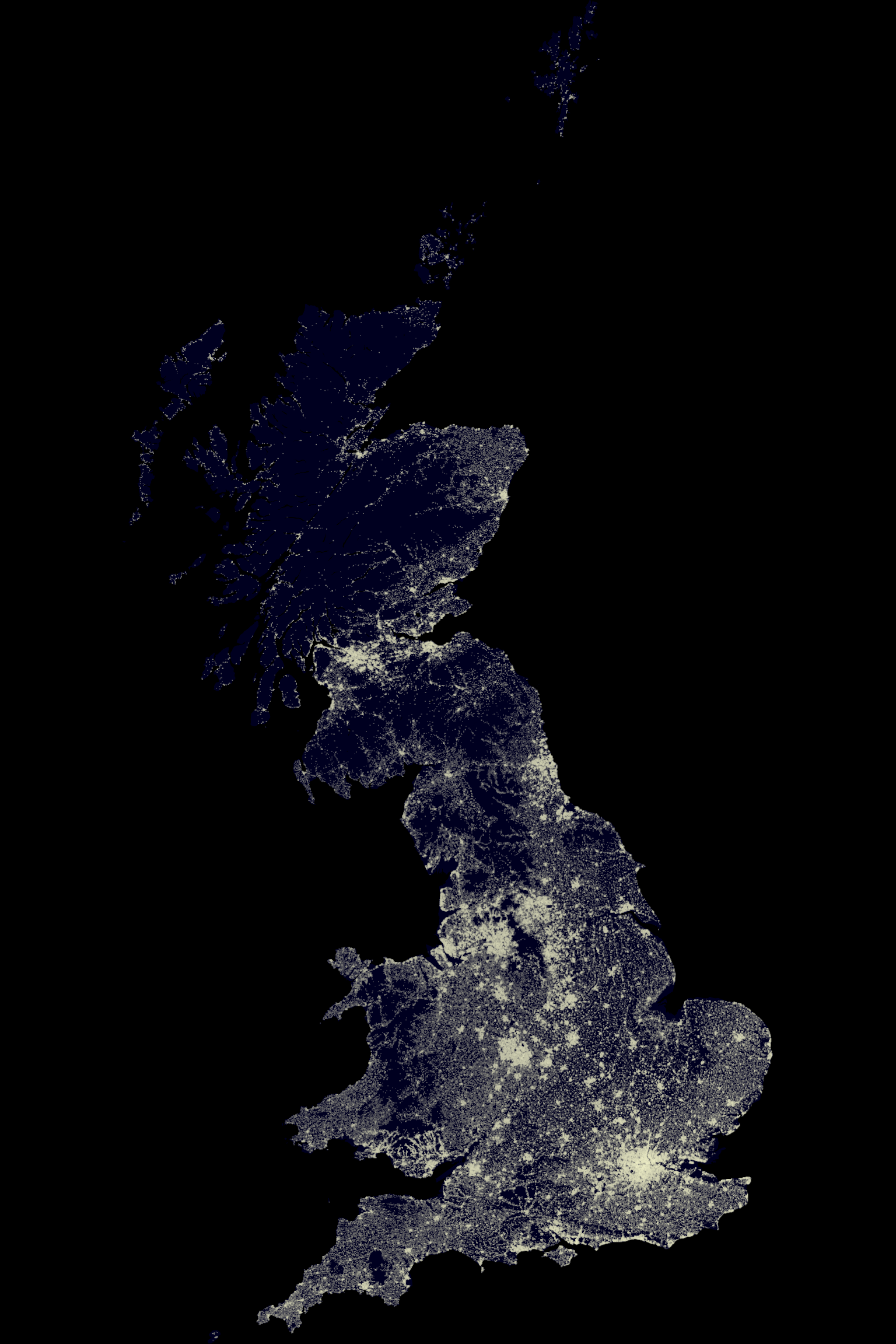 I seem to have quite a few readers from the UK on my blog. After my post last week showing the US at Night I got requests for a UK version. I don’t have a lot of data for the UK right now, so here is a quick map with the same methodology for UK population. When I get a copy of the UK census data, I will produce a map set with a bunch of variables like I did for the US.