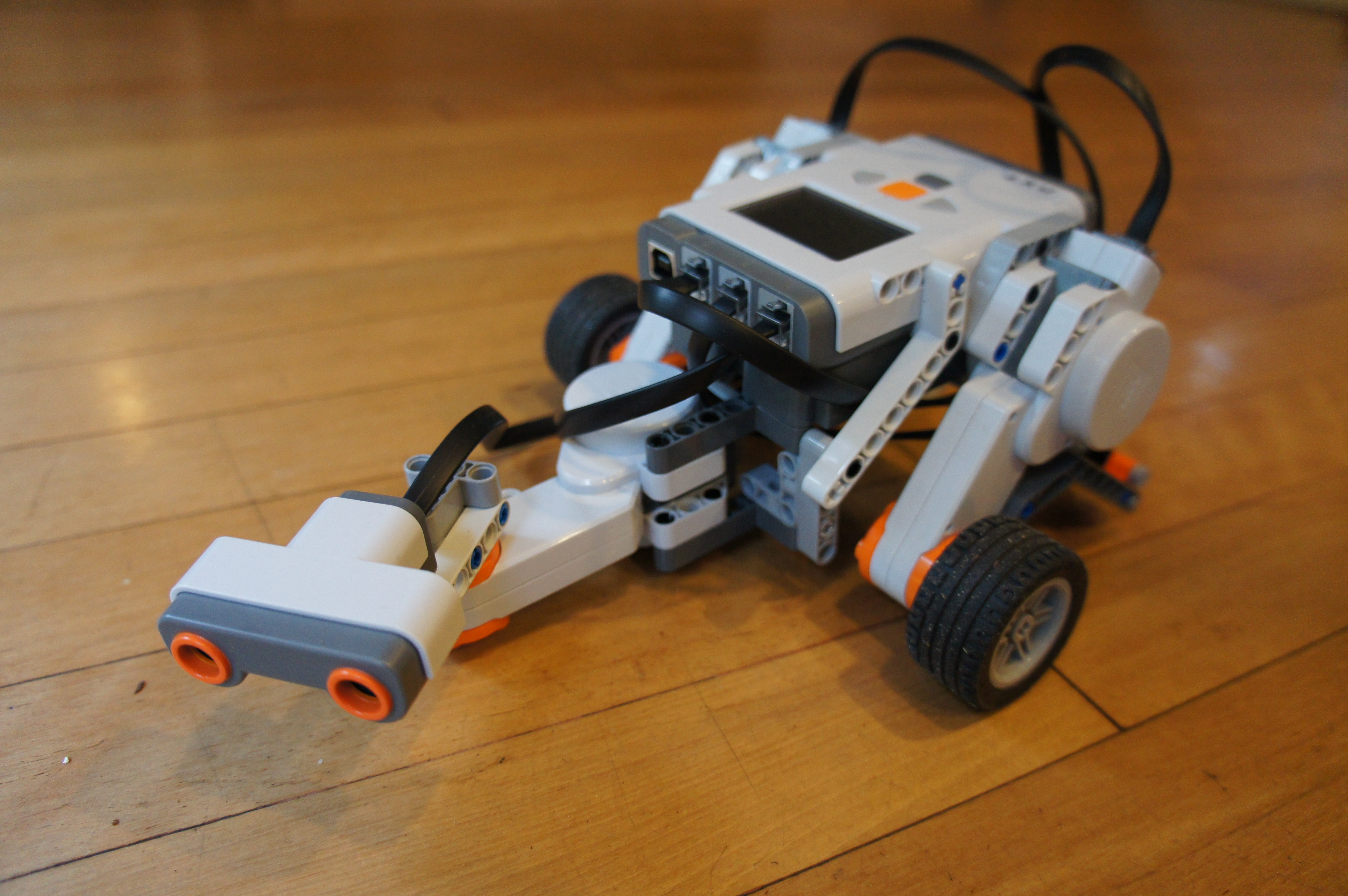 Charley and I sat down with the box of legos to come up with something more reliable. Aesthetics were part of the design goal, just function. The goals were to make it drive and turn reliably and also for its eyes to be on a shorter “neck” and lower to the ground. You can see the new design on the left – its not much to look at, but it works very well. We learned a few things on the way: