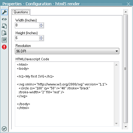 In order to give the appearance of seamless integration, I needed to make a macro that integrates HTML 5 into Alteryx. You can see from the screen capture that it is a cross between the R tool and any random reporting tool. Like the R tool you can put code directly into the configuration. In addition to the code, you get to specify the size of the canvas in inches and the resolution of the output, like other reporting tools. This allows you to print reports containing these charts and not have them look pixellated. When displaying on-screen, it is best to keep the resolution at 1X, otherwise the scaling down can make it look fuzzy.