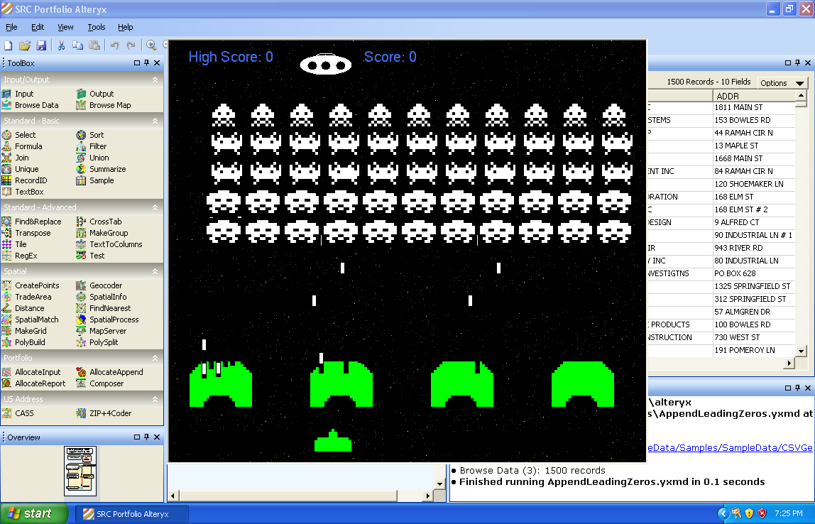 I went through the exercise of installing a Windows XP virtual machine (it wanted to give me the what’s new in XP tour!) and resurrecting a copy of Alteryx 1.0. I had a little bit of a hard time finding the correct version of .Net and the C++ runtime DLLs, but after I did it was nice to see it come alive from the archives. The best news is that our old license server is still running after all these years and I didn’t have any problems getting it licensed and running.