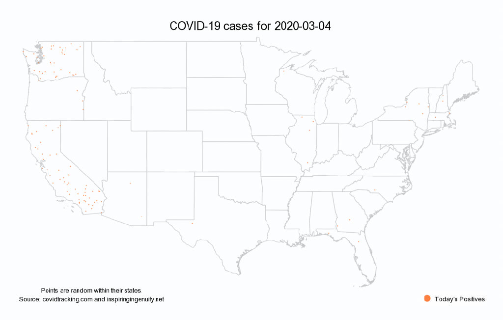 So for the next map, I am making 2 changes. The first is that I am going to show a dot for each person that is currently infected with COVID-19. This is easy to understand. Since I don’t have actual point data of the real people being infected, I am picking a random point in their state. Going out to the state level leaves more room to disperse the NYC points and show the severity of the problem.
